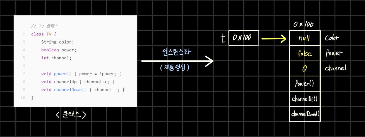 - 인스턴스 : 특정 클래스로부터 생성된 객체 (ex. Tv 인스턴스)