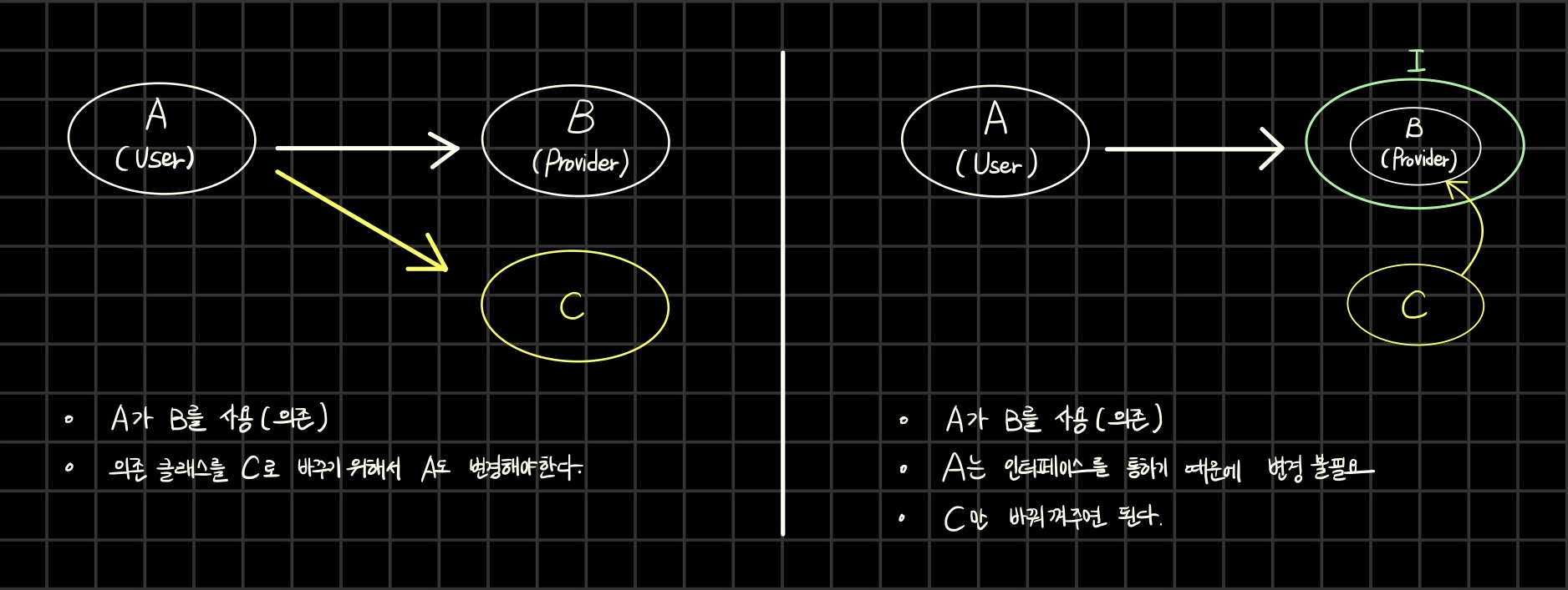 // 의존관계가 C 클래스로 변경되면 코드 변경이 발생 (B ➡ C)