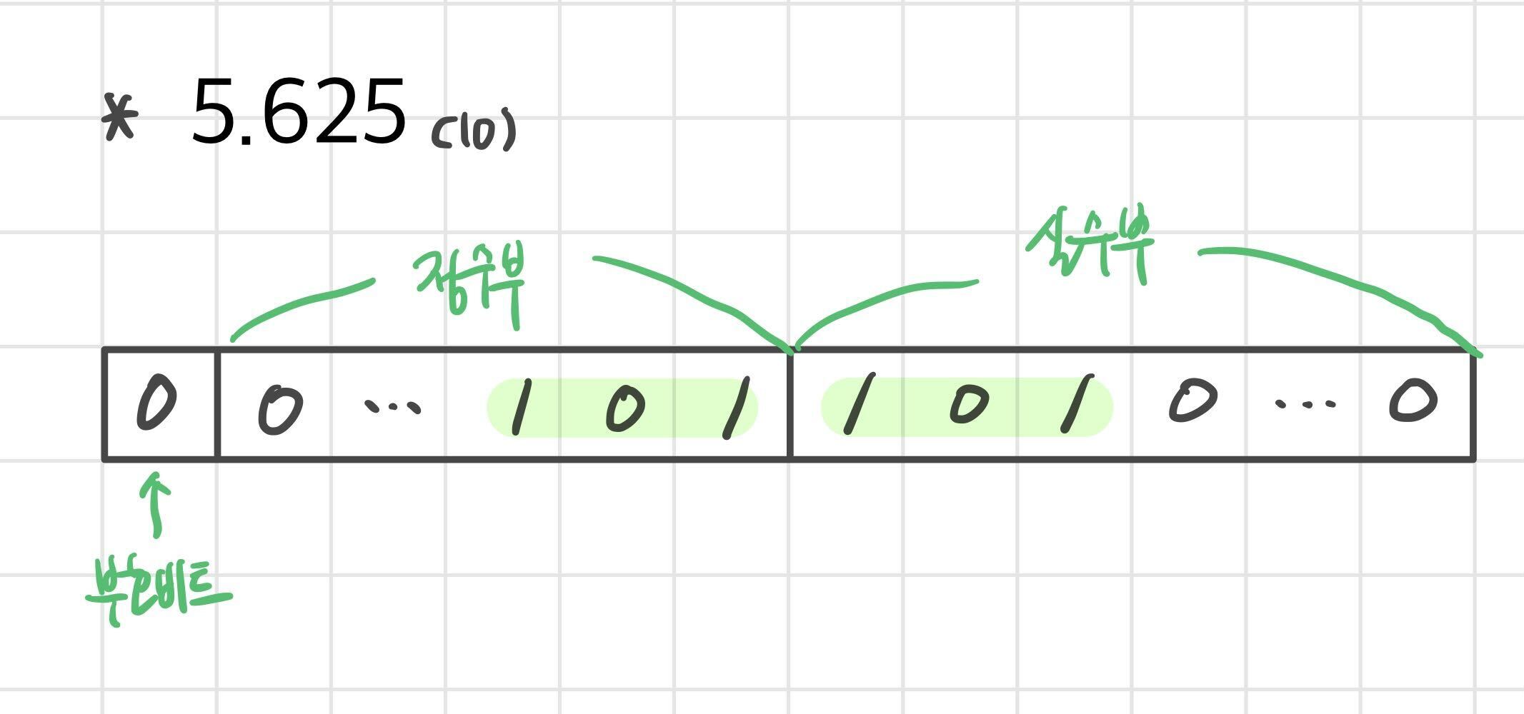 - 메모리를 정수부와 소수부로 나누어 2진수로 변환한 실수를 저장한다.