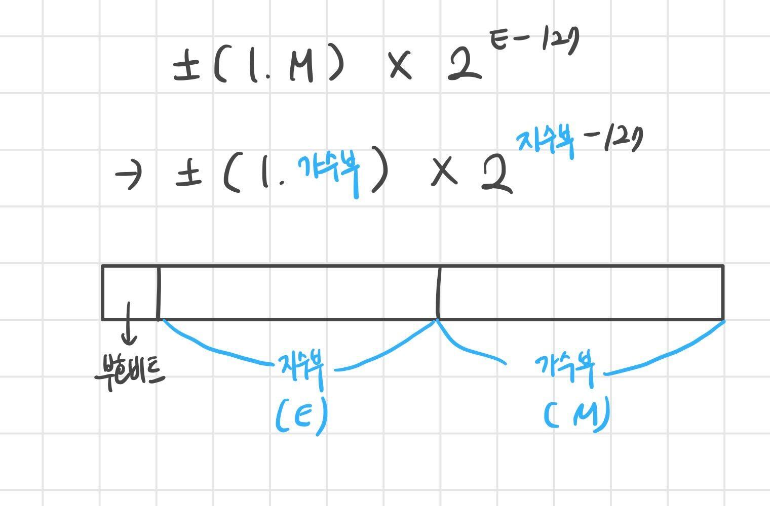 - 가수부에는 실제 실수 데이터 비트들이 들어가고, 지수부에는 소수점의 위치를 가리키는 제곱승이 들어간다.
