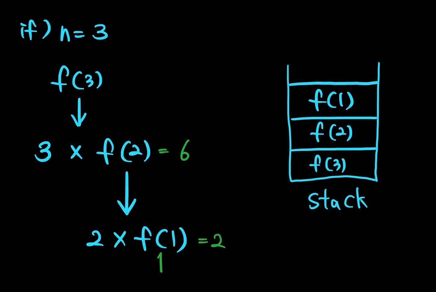 그러나 위 코드처럼 재귀함수일 경우엔 입력크기 n의 값에 따라 공간복잡도가 달라진다. 메소드 내부에서 n이 이 1이하가 될 때까지 factorial()메소가 재귀적으로 호출된다. 스택에는 n부터 1까지 쌓이며 공간복잡도는 O(n)이다.