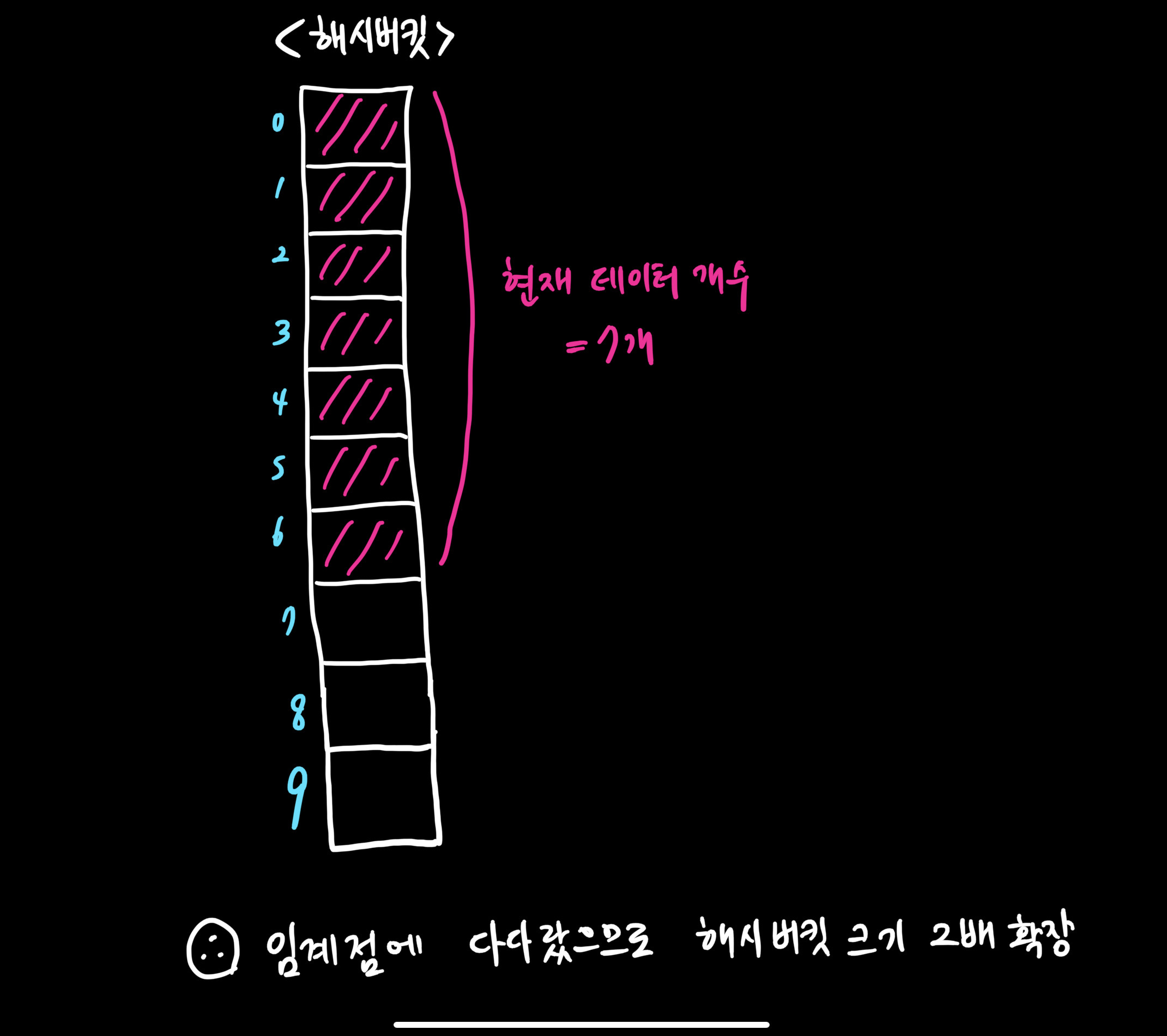 배열의 사이즈가 적다면 메모리 사용을 아낄 수 있지만 해시충돌로 인해 성능상 손실이 발생한다. 그래서 HashMap은 키-값 쌍 데이터 개수가 일정 개수 이상이 되면, 배열 사이즈를 2배로 늘린다. 이렇게 배열 사이즈를 늘리면 해시 충돌로 인한 성능 손실을 어느 정도 해결할 수 있다.