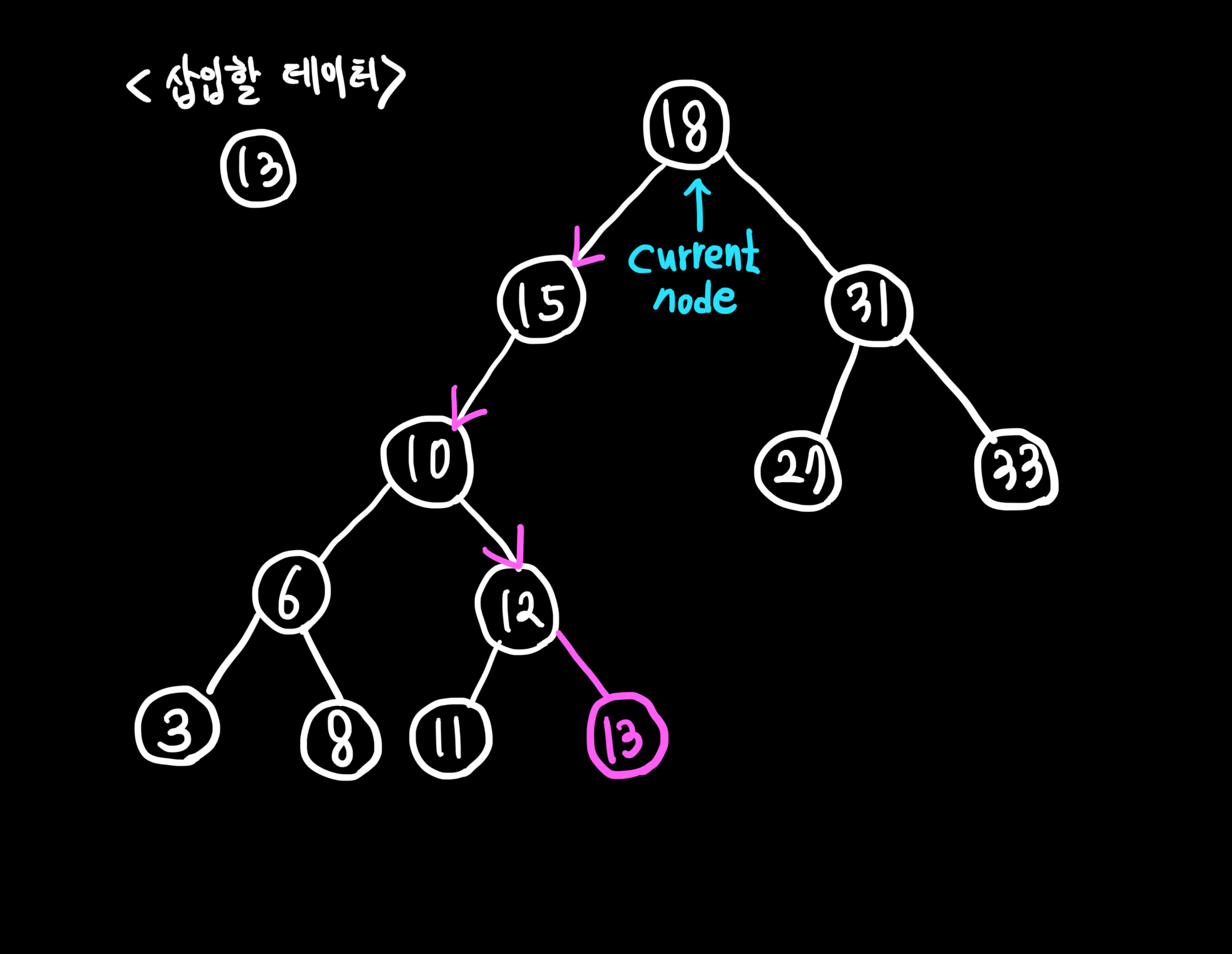 - 이진 탐색 트리의 데이터 삽입과 탐색은 루트노드부터 시작해 null을 만날 때까지 비교하면서 좌우로 내려가는 작업이다.